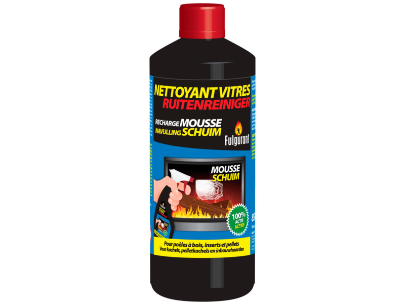 Ruitenreiniger voor het schoon maken van kachelruiten. Ultra actief schuim, onmiddelijke doeltreffendheid, tast de afdichtingen niet aan, resultaat verzekerd. Ideaal voor kachels, pelletkachels en inbouwhaarden.