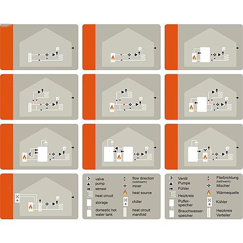 De regelaar is in staat een verwarmings mengroep aan te sturen welke de warmte uit te buffertank onttrekt doormiddel van een pomp en een mengmotor. Ook kan deze regelaar een back-up gas of olie cv-ketel aansturen of een elektrische element. (cv-ketel met hoog/laag sturen? zie dit product)